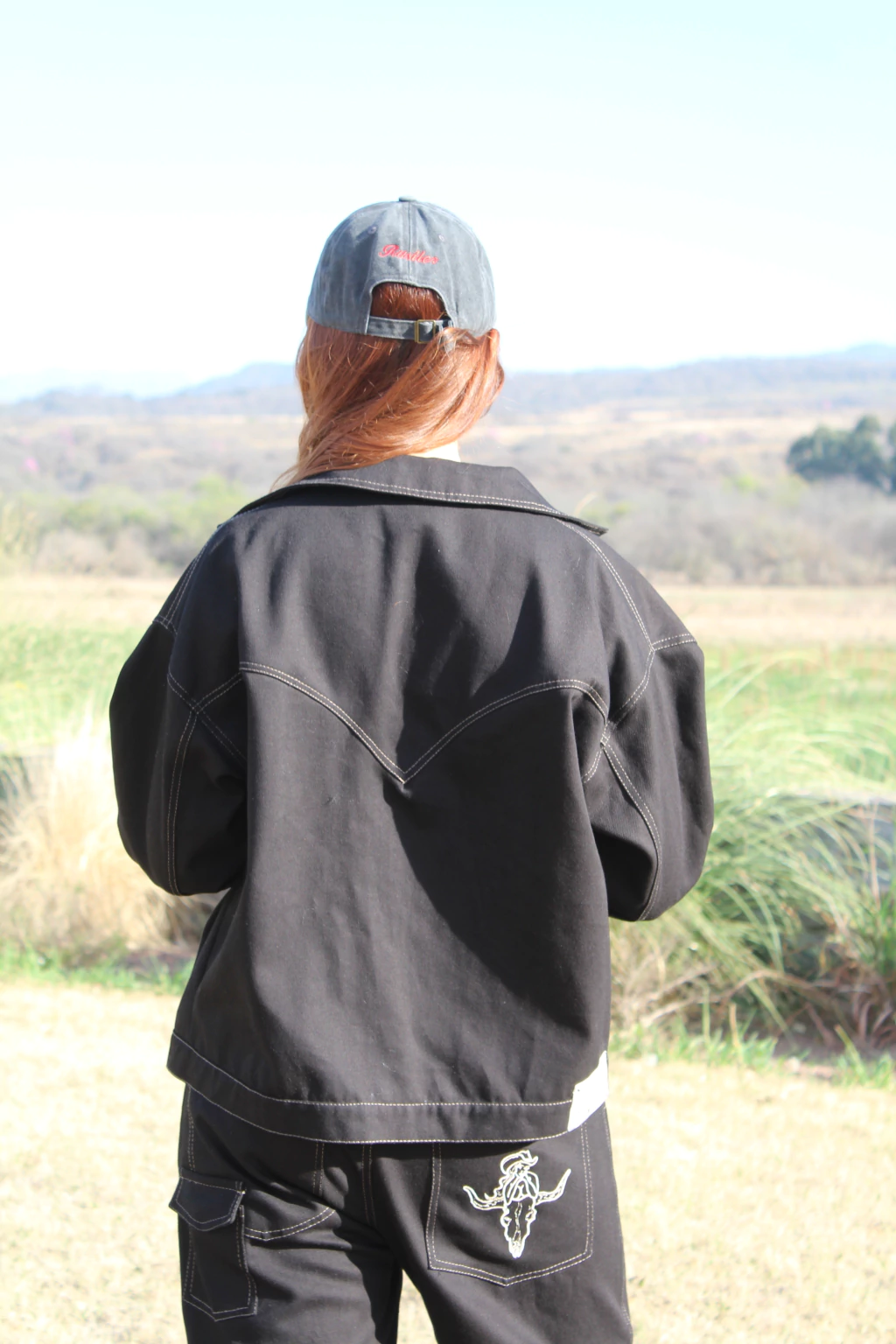 Confeccionada en jean negro de algodón, liviano y suave al tacto, pa’ que la uses sin miedo. No achica con el lavado, tiene costuras reforzadas y detalles bordados que le ponen el sello distinto.