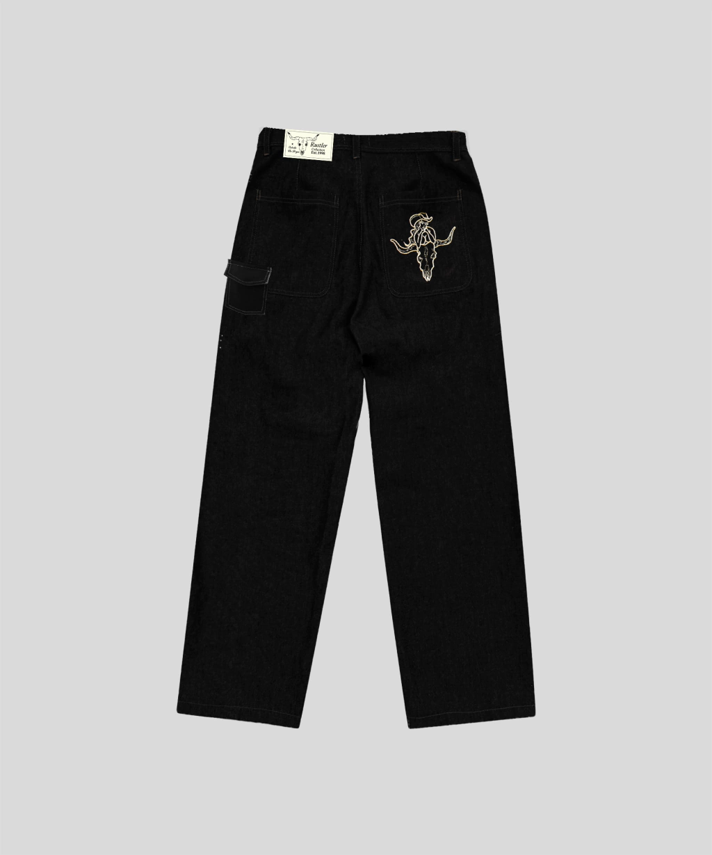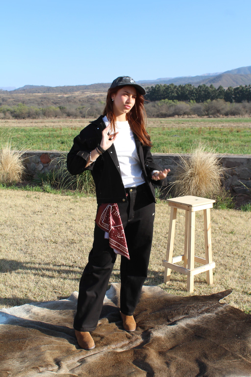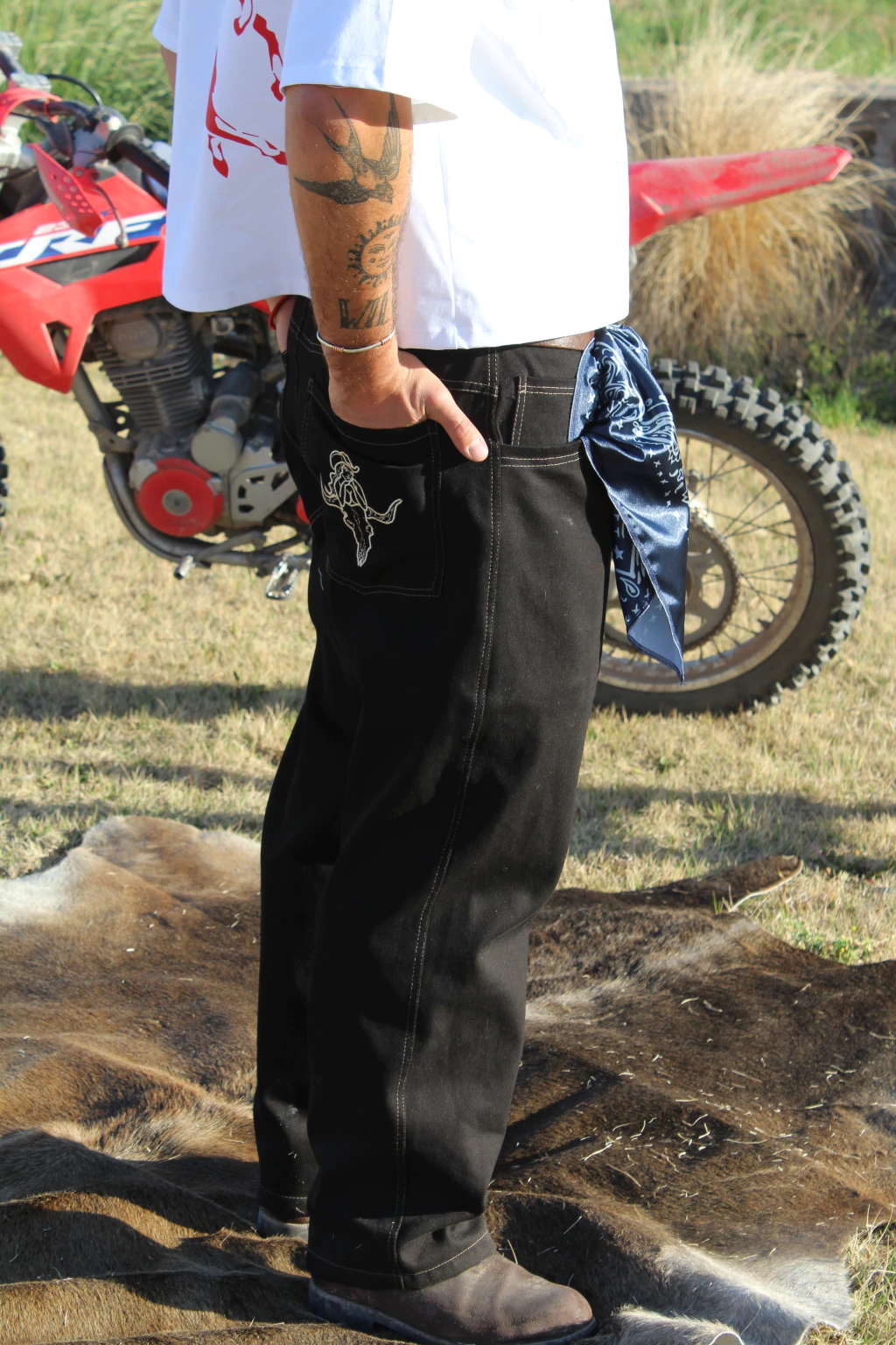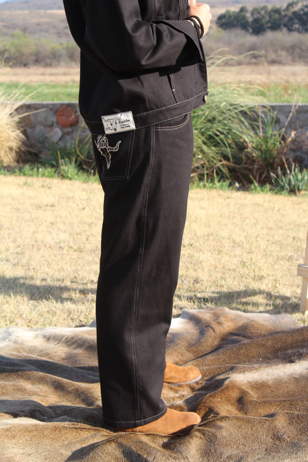 Confeccionado en jean negro de algodón, liviano y suave al tacto, pa’ que lo uses sin miedo. No achica con el lavado, recto de corte clásico, con costuras reforzadas y detalles bordados que le suman carácter.