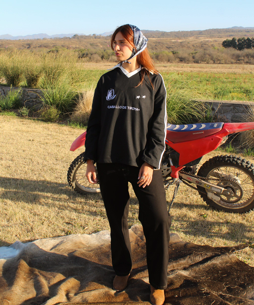 Tiene bordados en el frente y la espalda, costuras doble reforzada, pensada pa’ bancarse el día a día, en el campo o la ciudad.